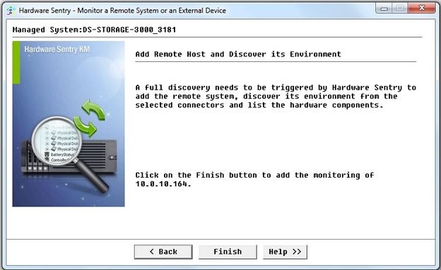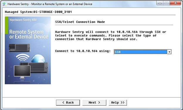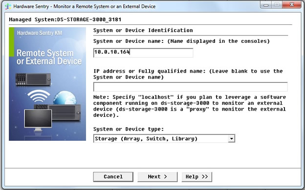 - Enter the name or IP address of the IBM DS array’s management card to be monitored and click Next.