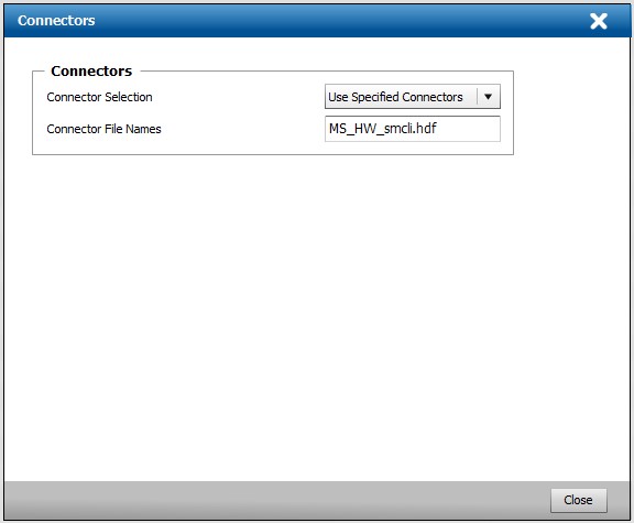 - Select Use Specified Connectors, enter MS_HW_smcli.hdf as Connector File Name and click Close.