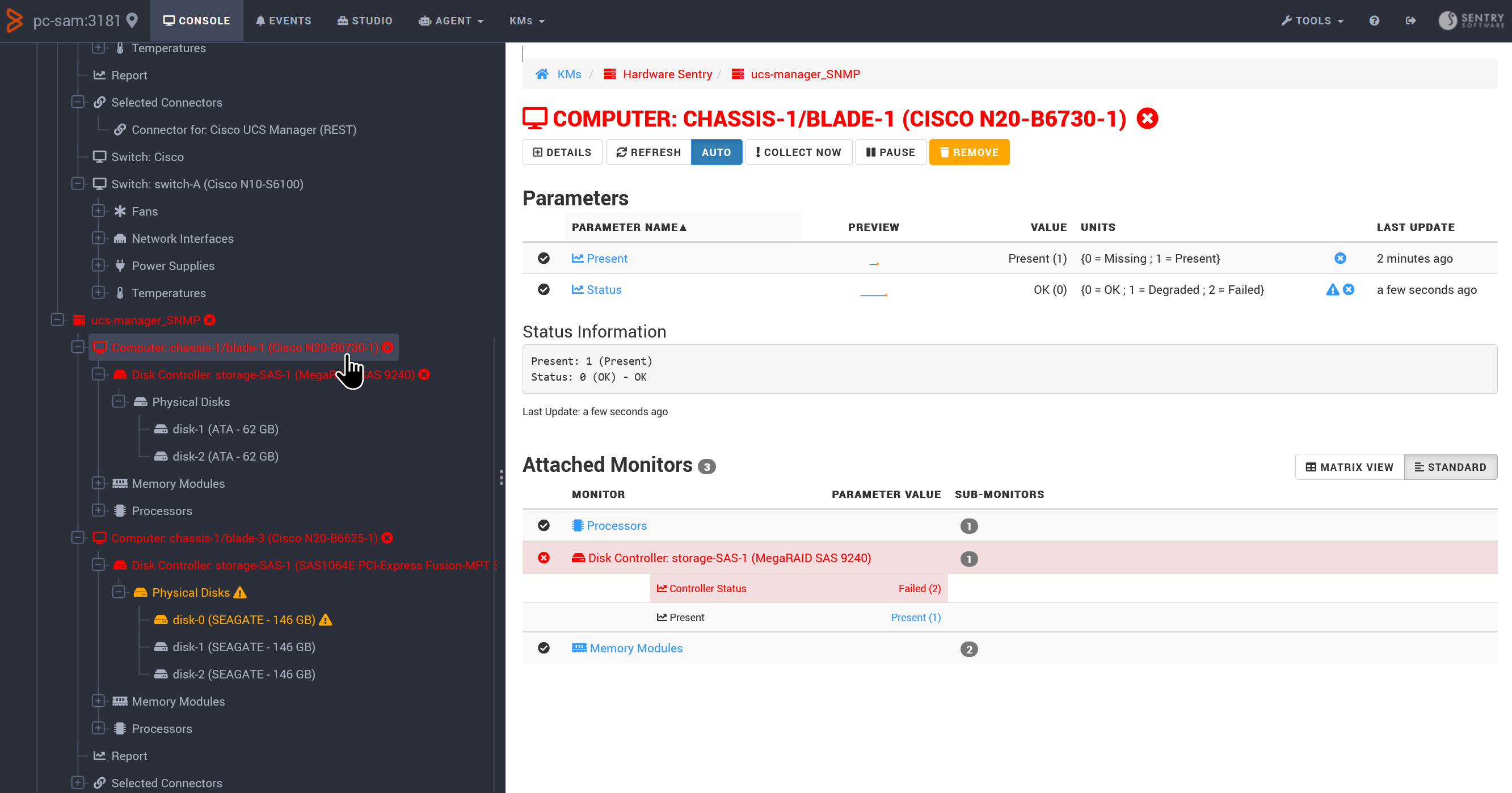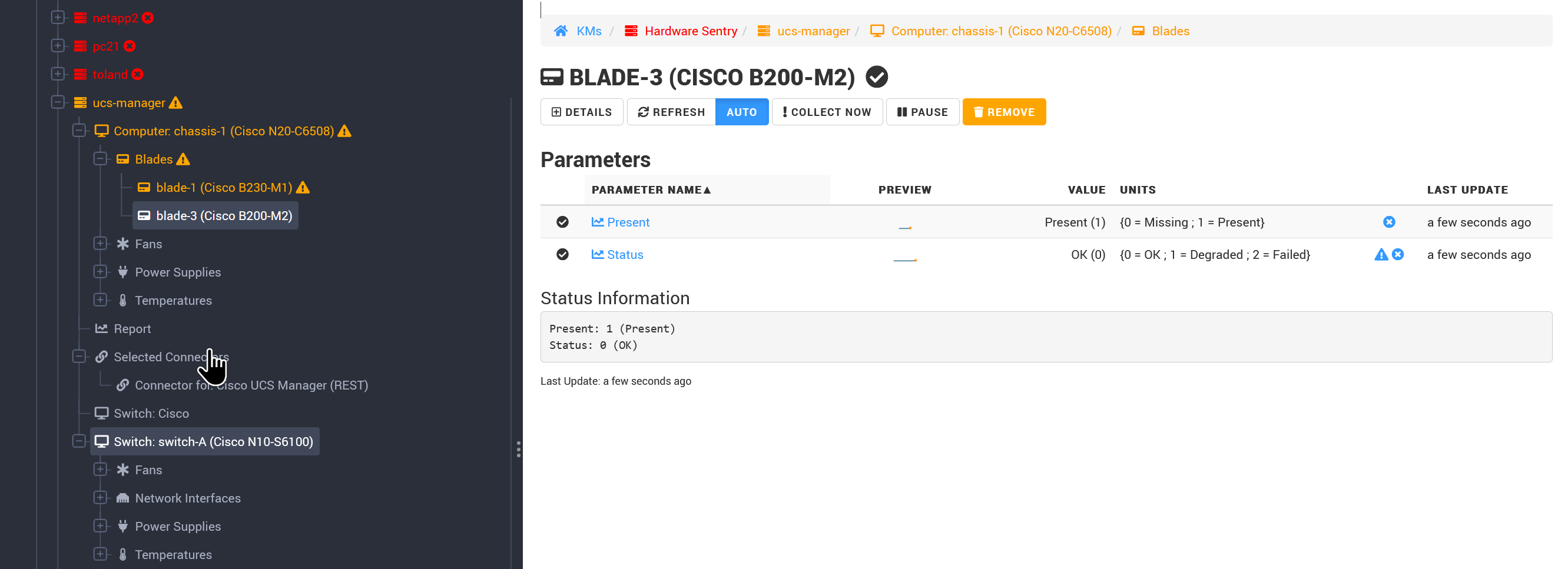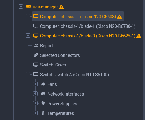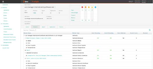 In order to cover the entire UCS B-Series platform, Hardware Sentry KM connects to the switch to gather all metrics related to the main chassis and the switch.