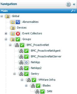 While with BMC PATROL information is displayed in a hierarchical view, the data collected by the Sentry KMs is displayed as different devices in BMC ProactiveNet Performance Management. Because this display does not clearly show relationships between devices, you may want to create a hierarchical view. This can be done either by creating groups or by including the relevant devices into your Service Model.