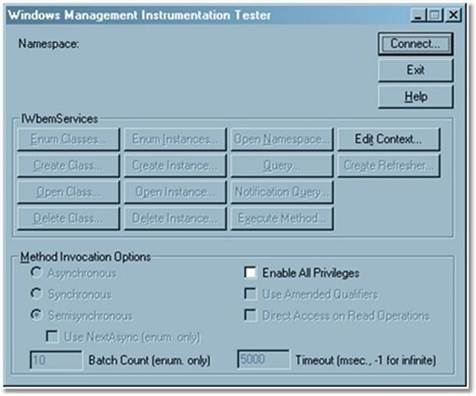 - Click Start > Run > type wbemtest > OK. Then click Connect…
