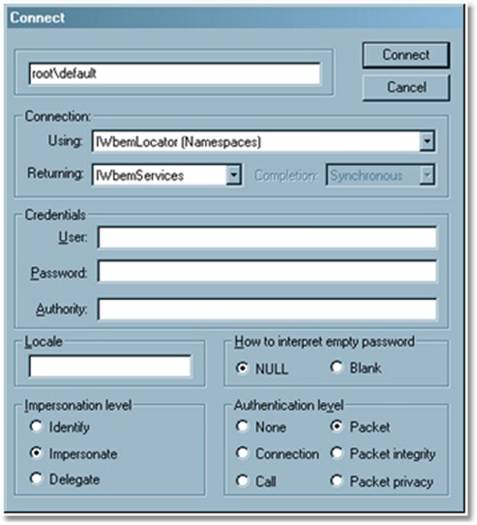 Run WBEMTest - In the first field displaying root\default, type \\servername\root, where ‹servername> is the name of the server you want to test: