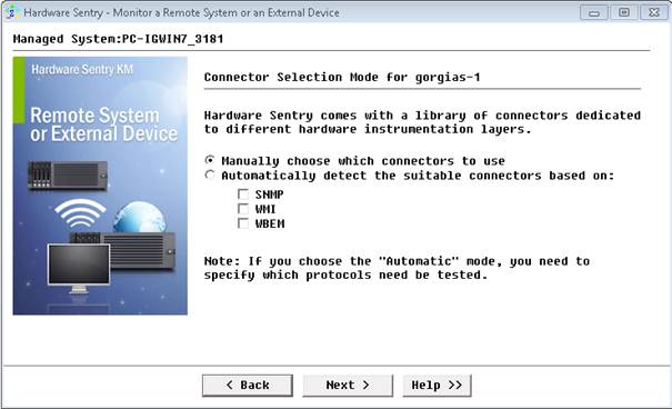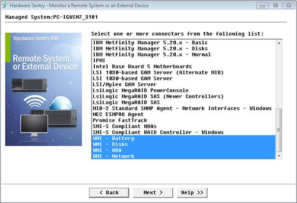 - Select one or several WMI-based connectors (WMI - Battery, WMI - Disks, WMI - HBA, WMI - Network) and click Next.
