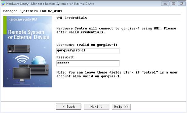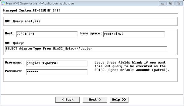- Specify the Windows 2008 Server to be monitored (e.g.: GORGIAS-1), the WMI Query to be run, the local admin account to be used (e.g.: gorgias-1\patrol) and click Next.
