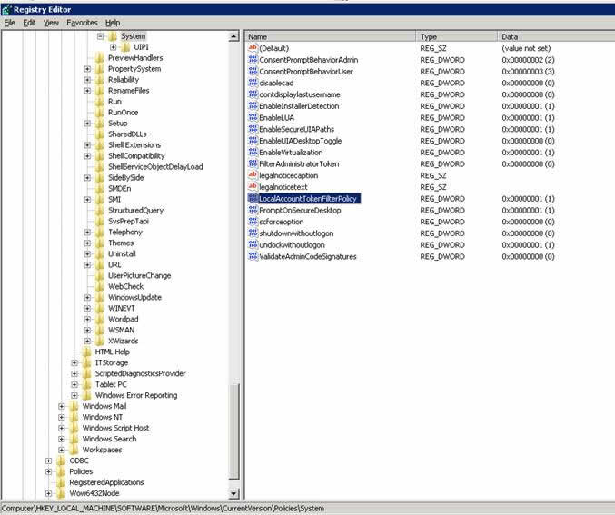 - Under HKLM\SOFTWARE\Microsoft\Windows\CurrentVersion\Policies\system, create a new DWORD entry called LocalAccountTokenFilterPolicy