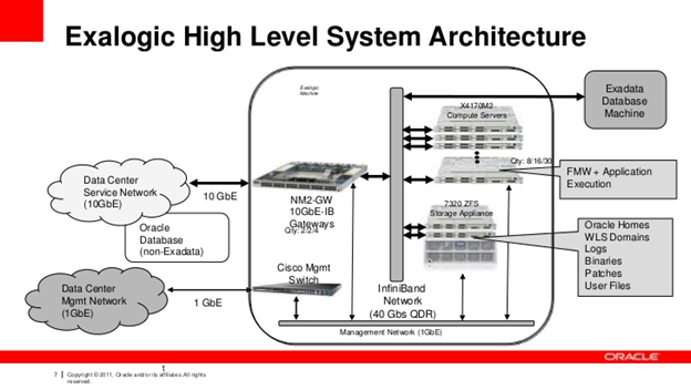 Oracle’s Exalogic systems contain Compute Nodes, ZFS Storage Systems, InfiniBand Switches and a Cisco Management Switch.
