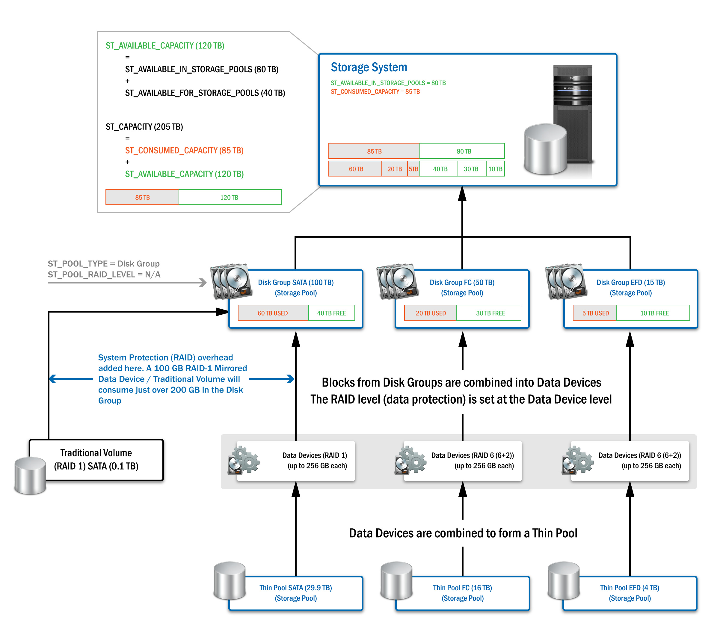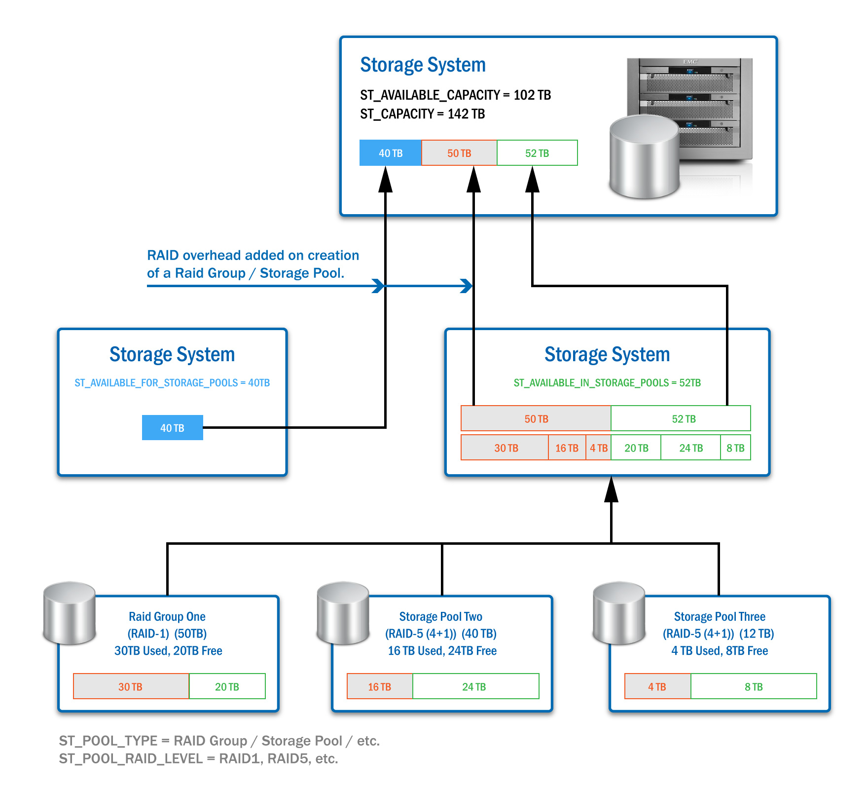 Note: RAID overhead is added on creation of a RAID Group / Storage Pool. A RAID Group / Storage Pool of size 1TB of type RAID-1 will result in a 2TB reduction in ST_AVAILABLE_FOR_STORAGE_POOLS, a 1TB increase in ST_AVAILABLE_IN_STORAGE_POOLS and a 1TB reduction in ST_CAPACITY / ST_AVAILABLE_CAPACITY.