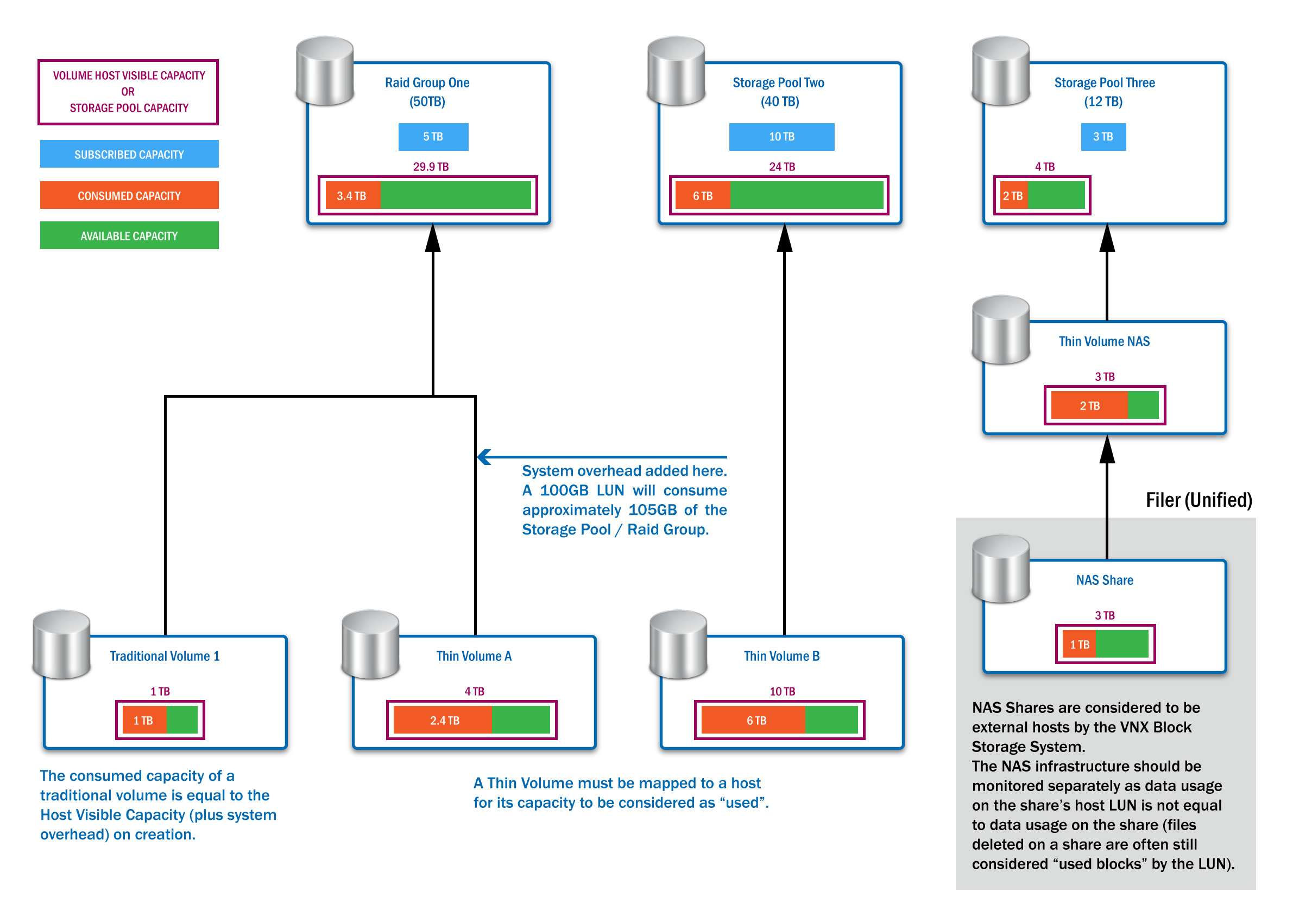 - 50TB are consumed capacity. This value is reported in BMC TrueSight CO by the ST_CONSUMED_CAPACITY metric and is the sum of the space consumed in the capacity allocated from storage pools. For Thin Pools, it corresponds to the Host used capacity (excluding RAID overhead); for Traditional Pools and Disk Groups, it corresponds to the System used capacity (including RAID overhead).