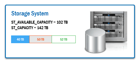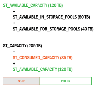 - 120TB are available capacity. This value is reported in BMC TrueSight CO by the ST_AVAILABLE_CAPACITY metric and is the sum of the capacity available in storage pools (ST_AVAILABLE_IN_STORAGE_POOLS) and for storage pools (ST_AVAILABLE_FOR_STORAGE_POOLS).