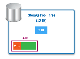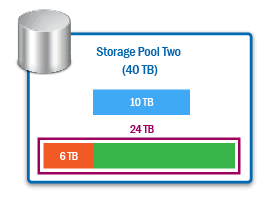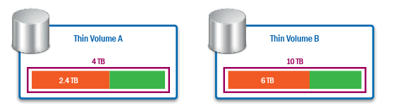 The "consumed capacity" and "available capacity" of a thin volume is equal to the amount of data (capacity) used by the host. For Thin Volume A, 2.4TB have been consumed from the 4TB visible capacity. For Thin Volume B, 6TB have been consumed from the 10TB visible capacity.