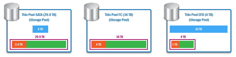 - Thin Volume B which is bound to EFD Thin Pool but its capacity (10TB) is allocated from the three available thin pools. Indeed, a volume can be bound to a single pool and be allocated from several.