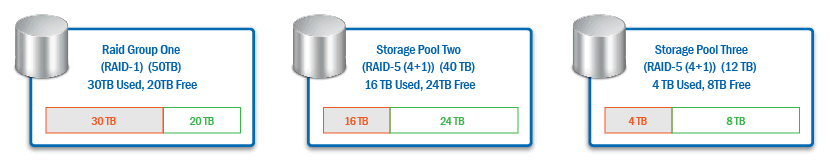 To allocate storage, we first combined groups of physical disks to form the following RAID Groups and Storage Pools: